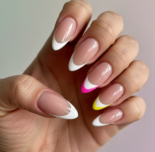 For a fun and vibrant twist, neon colors on almond nails are eye-catching and playful. Perfect for summer, this design brings a pop of color and a bold statement.