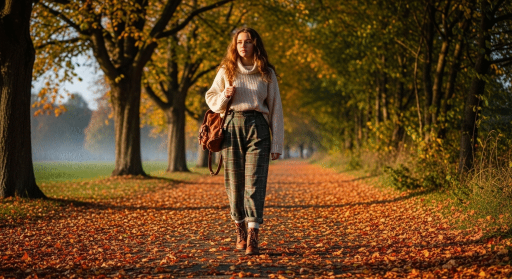 Plaid pants paired with a chunky sweater create a stylish, comfortable back-to-school outfit for fall. The relaxed fit of the pants contrasts with the cozy, oversized sweater, offering a balanced and laid-back style. Complete the look with ankle boots or sneakers to ensure comfort during long school days. The bold patterns and rich colors of plaid are perfect for embracing the autumn season while staying warm.