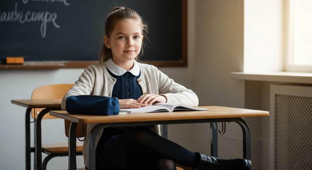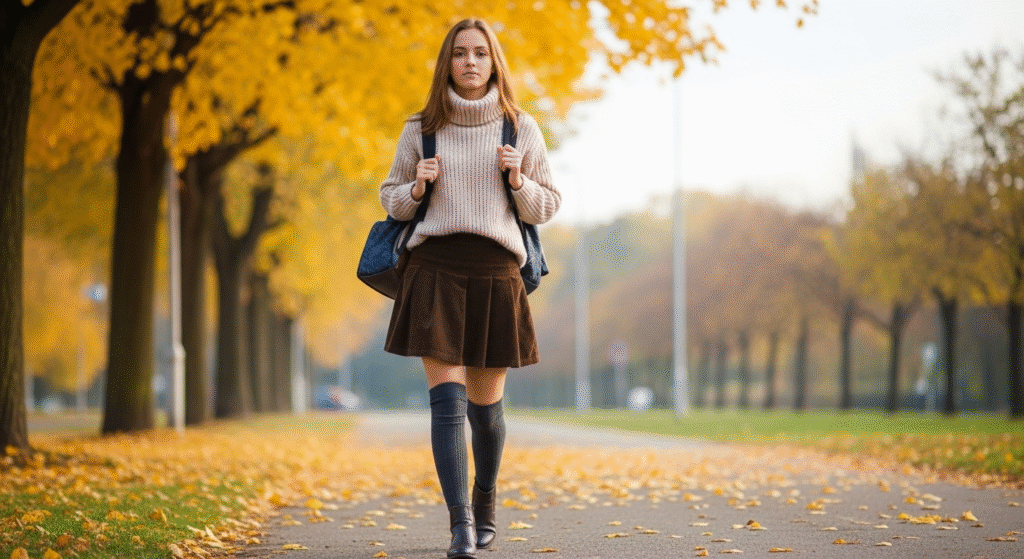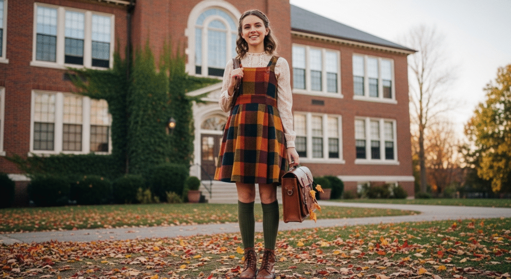 An A-line dress paired with leggings and a cardigan creates an effortlessly elegant fall look. The A-line dress provides a flattering silhouette, while the cardigan adds a layer of warmth for crisp mornings. Leggings make it easier to move around comfortably, and the look can be completed with stylish boots. This outfit strikes the perfect balance between comfort and class, ideal for a schoolgirl navigating the autumn season.
