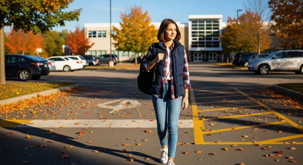 A puffer vest over a plaid shirt and jeans is a sporty, cozy look that’s perfect for fall. The puffer vest ensures you stay warm, while the plaid shirt adds a touch of autumn style. This casual yet practical look is perfect for running around campus and keeping comfortable on colder days. Paired with jeans and sneakers, this outfit is both functional and on-trend for school.
