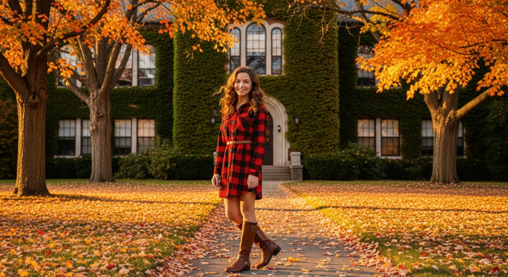 A plaid shirt dress is a great fall wardrobe staple that combines comfort with style. The relaxed fit of the shirt dress allows for easy movement, while the plaid pattern adds an autumn-inspired twist. Paired with knee-high boots or ankle boots, this outfit is both warm and practical for school. Whether layered with tights or worn as is, it’s a chic, cozy look for fall.