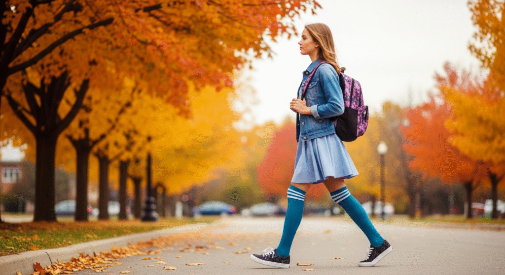 A denim jacket and skater skirt is a great way to balance casual and chic. This fall look allows for freedom of movement, with the skirt adding a touch of playfulness and the jacket providing warmth as the weather cools. Pair with tights or knee-high socks for extra comfort, and slip on sneakers or ballet flats to complete the look. It’s a versatile and fun outfit perfect for everyday school wear.